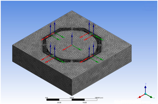Equation (7) correlates the stress values to the fractional resistance change. Data of stresses are then extracted from the simulation by placing probes on the piezoresistors locations, allowing to obtain longitudinal and transversal stress values on an Excel spreadsheet, and sensitivity and cross sensitivity are eventually calculated. Sensor sensitivity is calculated using the Equation (11). Basically, from the FEA software ANSYS we obtain values of stresses (longitudinal and transversal for all three axes) exactly in the locations where the 16 piezoresistors are placed (Figure 4a and Figure 5). Using Equation (11) we obtain 16 values of resistance, one for each piezoresistor (note that the value of longitudinal piezoresistive coefficient is the one reported by Smith [29]) and with these values we calculate voltage output for each axis (see Equation (8) for Wheatstone Bridge configurations). Finally, we obtain value of sensitivity applying Equation (9), just dividing the voltage output of each axis for the applied external acceleration (500 G). Notice that the voltage in has a value of 5 V. Cross-axis sensitivity is then calculated by applying Equations (12) and (13).