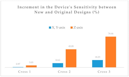 Sensitivity and cross-axis sensitivity have been calculated for the new designs under study and compared to the original circular device design. In Figure 6, the increment in the sensitivity between the new and original designs is shown.