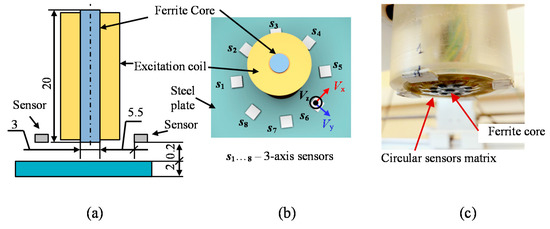 The view of the matrix transducer as well as a diagram of the measuring system are presented in Figure 1 and Figure 2. The matrix transducer has two subunits for excitation and pick-up function [12]. The excitation section (EXC) is built using a coil wound on a rod ferrite. Whole construction is centrally placed and generates an axially uniform field, which operates in the perpendicular direction to a surface of a tested material. Any disturbance of the field is sensed by eight digital magnetic sensors (s1–s8). The sensors are placed over the circumference of the transducer with a spacing of 45°. Each sensor allows for observation of the three-dimensional magnetic field vector V = (Vx, Vy, Vz). The sensors are positioned so that the x sensitivity axis of each one is tangential to the circumference (Figure 1). Monitoring of all three components provides information that can be crucial for the identification of defects. Observation of the shape and the gradient of magnetic field disturbance over the examined object results in growth of the evaluation accuracy of not only depth, but also orientation or dimension of the defects [9,10,11,14,36]. The information content of the measured magnetic field can be analyzed under different terms providing various data about the defect parameters (Table 1).