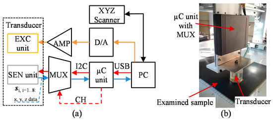 The utilized measuring system configuration diagram (a) and photo (b). EXC—excitation section; SEN—sensors; AMP—amplifier; MUX—multiplexer; CH—channel; XYZ Scanner—Cartesian coordinate robot; D/A—digital-to-analog converter; µC—microcontroller; PC—personal computer.