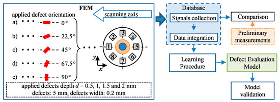 The diagram of the utilized defect evaluation procedure is presented in Figure 3. First, in order to prepare a database containing various possible configurations of the defect arising in the examined steel element, FEM numerical simulations were run using the COMSOL software. The defects having successively selected depths and orientation within the whole range of physical dimensions of the tested object were considered. The set of magnetic field vectors V sensed by the multi-sensor transducer was then collected. In order to verify the conditions applied during the computational process, the numerical simulation results were compared with the measurements for several selected defect arrangements. Next, in order to combine the data gathered by the matrix of sensors, the data integration algorithm based on fan-beam tomographic reconstruction procedure was utilized. Finally, three DCNN structures were constructed and used to carry out the defect characterization.