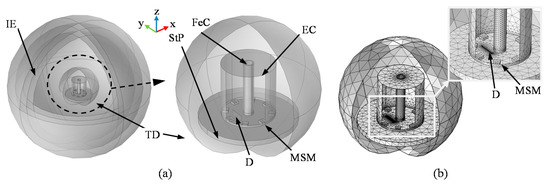 Utilized FEM model of the transducer: IE—infinite element domain, TD—transducer’s domain, StP—steel plate, MSM—multi-sensor matrix, FeC—ferrite core, EC—excitation coil, D—defect; (a) model view, (b) computation mesh view.