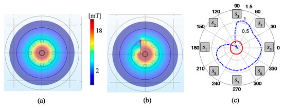 Selected results of flux distributions obtained during FEM simulations: (a) without defect; (b) with defect; (c) polar plot of the Vz component of the flux sensed by the successive sensors normalized to maximum value.