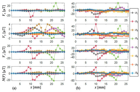 Comparison of selected results of magnetic field vector components acquired by all sensors for 1D scan along the 100% defect aligned at 0° to scanning direction obtained during FEM numerical simulations (a) and measurements (b).