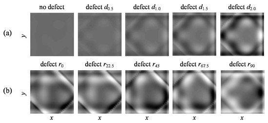 Selected results of reconstruction procedure obtained for: (a) different depth of the defects aligned at 0° (r0); (b) different orientation angle and depth of 2 mm (d2.0); the size of each reconstruction is 43 × 43.