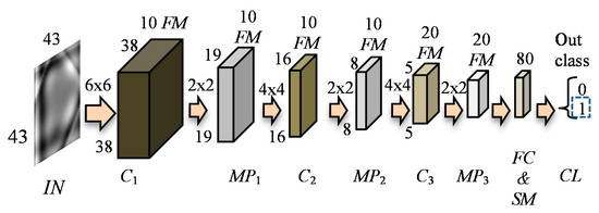 Schematic view of the deep convolutional neural network (DCNNDND) architecture for evaluation of defect occurrence; layers: IN—input, C—convolutional, MP—max-pooling, FC & SM—fully connected and softmax, CL—classification; FM—feature maps.