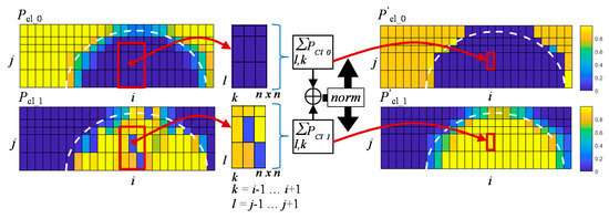 In this paper, a Moore neighborhood was utilized to calculate the new distribution of class probabilities [38]. The schematic visualization of the class probability assignment update algorithm for the DCNNDND case is presented in Figure 11. First, the probabilities of both class occurrences (0—defect not present, 1—defect present within the sensitivity area of the transducer) over the whole considered area were predicted using the DCNNDND model: where PCl_0(x, y) is the probability of class 0 and PCl_1(x, y) is the probability of class 1. Then, for each cell, the neighborhood mean probability of a given class assignment was calculated using the Moore neighborhood. The updated probabilities P’Cl_0(x, y) and P’Cl_1(x, y) in the observed cell were calculated utilizing the formula: