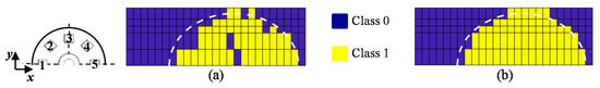 Visualization of the DCNNDND class evaluation results: (a) before and (b) after utilization of class probability update algorithm; class 0—defect not sensed by the transducer, class 1—defect indicated by the transducer; white dashed line depicts the circumference of the transducer.