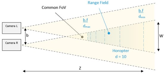 Rectangular imager sensors modifies the concept of circular FoV, as a consequence, it is specified as a Diagonal FoV, Vertical FoV and Horizontal FoV. Additionally, in this paper common FoV is defined as the overlap between the FoVs of the pair of cameras on a stereo rig. The common FoV between the left and right cameras defines the lateral boundaries (vertical and horizontal) of the Range Field (Figure 1). Employing fixed lenses (b.f = constant) the possible depth range to perform triangulation is defined for the range of disparities (dmin and dmax), which determines the rear and frontal boundaries of the Range Field.
