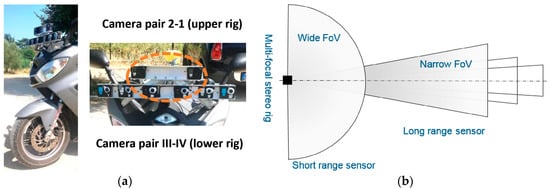 Overview of the imaging system. (a) Multi-focal stereo rigs installed in the frontal part of the vehicle and fixed to the scooter frame; (b) Top view of the 3D space to measure in front of the scooter (the outer stereo cameras are used for development purposes and future extension of the long range of measurement).