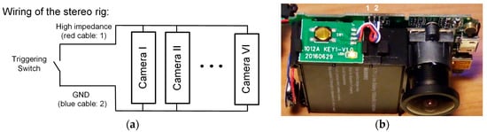 Wiring detail for the synchronization of the six cameras. (a) Circuital scheme; (b) A disassembled camera showing the location of the electrical connections labeled “1” and “2”.