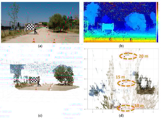 Depth accuracy quantification of the calibrated stereo camera (long-range camera rig). (a) Rectified left picture acquired by the long range stereo camera sensor; (b) Disparity Map of the scene (range from 0 to 128d); (c) Three-dimensional reconstruction or 3D point cloud of the scene imaged; (d) Top view of the 3D point cloud highlighting the location of the traffic cones originally placed at 10 m, 15 m, and 20 m. This 3D point cloud can be download according to Appendix B for a better assessment of the reader.