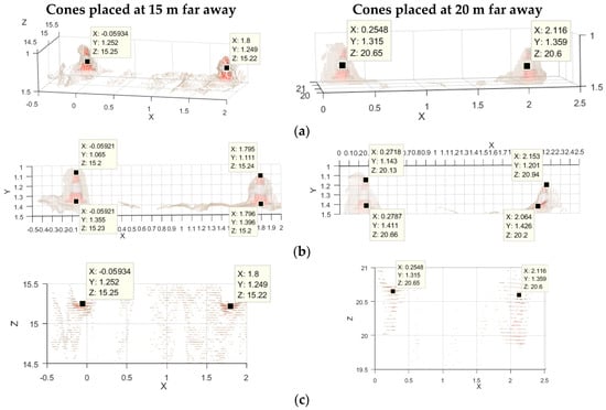 Analysis of small narrow objects in the farthest half of the Range Field (long-range camera sensor). 3D control points were located at similar places for each couple of cones for the analysis. (a) Detail of the 3D representation of the targets; (b) Frontal view of the targets (grid sized 10 cm); (c) Top view of the 3D point clouds (grid sized 50 cm). For the cones at 20 m the fattening effect becomes evident (depth artifact).