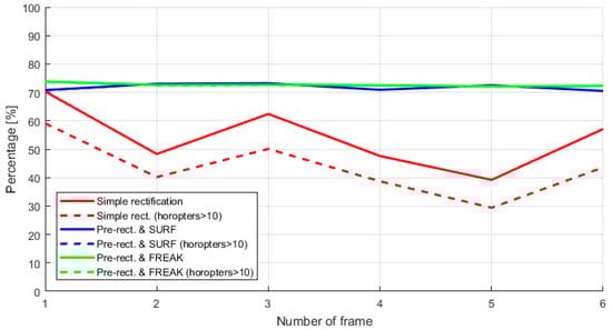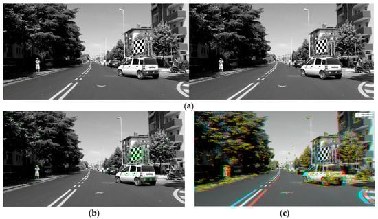 In Figure 7 is illustrated the procedure for the second step of the re-calibration implemented. First, calculate sparse point correspondences between the images rectified to identify 3D salient points of the scene (Figure 7b). Compute salient points per image with the point descriptor SURF. Next, putatively match the correspondent features between the images (Figure 7c) in order to estimate the “fundamental matrix” [,] thanks to the RANSAC (RANdom SAmple Consensus) method. Thus rectifying the images, it means, aligning the images such that corresponding points will appear on the same rows in both new images to perform triangulation.