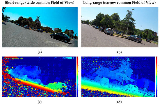 Consequently, we selected lenses through their FoVs. Next, the baselines for the two pair of cameras that allow having a common Depth of Field (DoF) enclosing the desired frustum, as shown in Figure 2b. Additionally, to ensure sharp images to be captured in the range of the sensor (e.g., short- or long-range) with the aim of performing the stereo triangulation, a trade-off between the FoV and the focal length was chosen (Table 1).