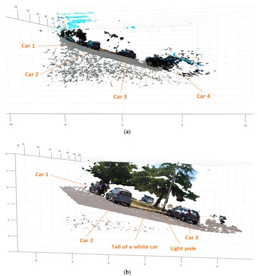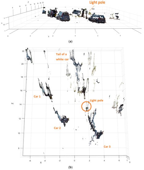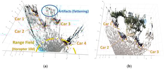 The point cloud calculations are not supposed for a real time application, it is only used for helping to assess the quality of the 3D information measured. For the top view of the scene (Figure 5d) the point cloud was calculated from 10 m to 22 m which corresponds with the Range Field of the long-range sensor. We highlighted the location of the 2nd, 3th and 4th couple of cones corresponding to the depth distance of 10 m, 15 m, and 20 m.