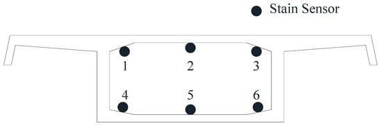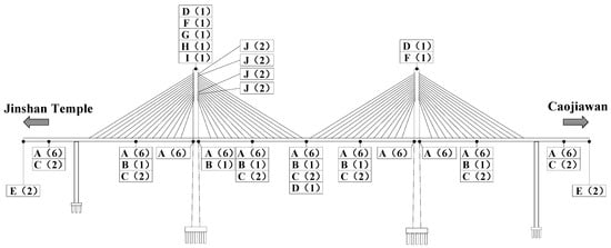 The Caijia Jialing River Bridge, located in Chongqing, China, is the second longest rail transit cable-stayed bridge in the world. The total length of the bridge is 1250 m, and the main structure is a dual-pylon dual-cable plane concrete cable-stayed bridge with rhomboic towers (Figure 1). The layout of spans is 60 m + 135 m + 250 m + 135 m + 60 m = 640 m. The bridge had established a comparatively comprehensive bridge health monitoring system to ensure the safety of serviceability, durability, and sustainability of the bridge. The overall layout of sensors is shown in Figure 2.