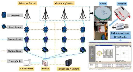 To measure the deformation of the pivotal components of the bridge, the GNSS kinematic deformation monitoring system was applied, which consists of a data acquisition system, data transmission system, lightning protection system, control and analysis system, and power system. A total of four stations were set up, including one reference station established in the non-deformation area, and three monitoring stations located at the top of the two main towers and the mid-span, respectively. Considering the impact of train operation on GPS, the mid-span measurement point was placed on the outside of the lateral deck. Dual frequency double star monitoring receiver GMX902GG (Leica Geosystems AG, St. Gallen, Switzerland) and antenna AS10 (Leica Geosystems AG) are applied in the four measuring stations. The data from the stations are transmitted by fiber optics transmission independently. The control and analysis system realizes the automation of data observation, data decoding and processing, and equipment management by GNSS Spider (Leica Geosystems AG). The working network of GNSS deformation monitoring system is shown in Figure 4.