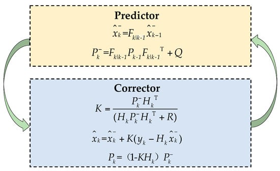 The Kalman filter uses a predictor-corrector algorithm to estimate as shown in Figure 5 [36]. Firstly, a tentative estimate is calculated based on the value of , then the measurement value is used to further refine the value of in order to obtain , which is the estimate of