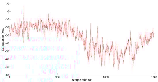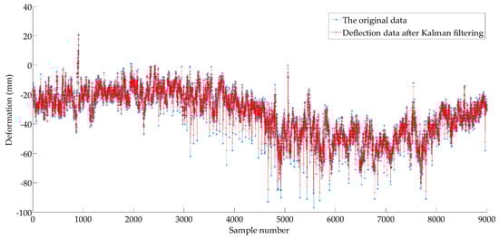 A collection of deformation data of mid-span of Caijia Jialing River Bridge measured by GNSS (including 9000 samples) is adopted to examine the effectiveness and reliability of the proposed method. The sampling period is 10 s. Due to the influence of random errors from light, temperature, and the sensors, the variation characteristics of little deformation with significant fluctuation often appear in the deformation monitoring. In this paper, the Kalman filter is used to de-noise the sample data. According to [39], there is a positive correlation between the measurement noise variance and the estimation performance of the filter, and a negative correlation between the system noise variance and the filter performance, in this study, , . The time series processing by the Kalman filter is called as , which is illustrated in Figure 6.