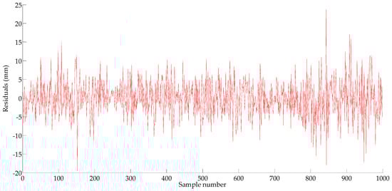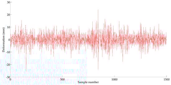 According to [7,8,10], a single prediction step is set to one minute. If the prediction is directly carried out by using the time series , the model needs six steps ahead for each forward prediction of 1 min. It is obvious that too many prediction steps will affect the prediction accuracy of time series models. In this study, is processed through the average value method every minute. In this way, the advanced 1 min prediction model needs only one step. Compared with the approach of the simple adjustment of the data sampling frequency, the maximum deformation value in the 60 s is retained while the GPS performance is guaranteed. The sequence (including 1500 samples) after averaging is shown in Figure 7. Here, the time series is divided into two parts: the 1st–1000th sampling points for training and the subsequent 1001th–15000th data for testing.