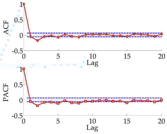 Figure 9 shows analysis results of by autocorrelation (ACF) and partial ACF (PACF). As seen from Figure 9, both ACF and PACF exhibit tails of infinite shock. The ARMA model is established to fit , which is equivalent to establishing an ARIMA() model fitting sequence .