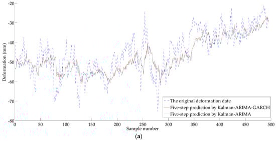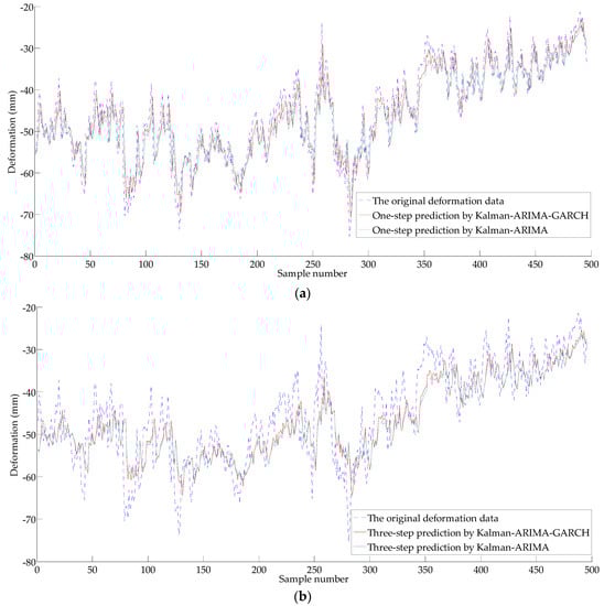 Results of the predictions for the original deformation series {X2t} by the ARIMA and the autoregressive conditional heteroscedasticity model (GARCH): (a) One-step prediction; (b) Three-step prediction.