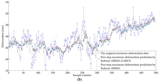 Results of the predictions for the original deformation series {X2t} by the ARIMA and the GARCH: (a) Five-step prediction; (b) Five-step maximum deformation prediction.