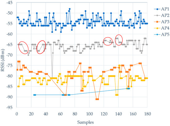The convenience of Wi-Fi technology has led to the establishment of a growing number of APs, and consequently a highly crowded AP environment. Moreover, since Wi-Fi technology has only at most three independent channels (for the 2.4-GHz band), APs interfere with one another to vie for the channels. From the viewpoint of Wi-Fi stations, this means some AP signals appear at certain times and disappear at others. An experiment shown in Figure 2 involves sampling at a given sample point for 180 samples. In Figure 2, AP signals use Channel 1 (2.412-GHz band), and the beacon signal of AP1 is one of the strongest RSSIs in this place, and all samples include the fresh signal from AP1. AP2 is not detected by the smartphone in a few samples; we indicated it with a red circle. The phenomenon is more obvious when AP with lower RSSI like AP3, 4, and 5 in Figure 2. Therefore, smartphones likely stochastically detect AP signals. Positioning algorithms used in smartphones should prevent this stochasticity.