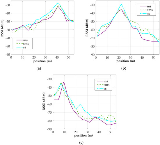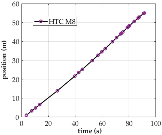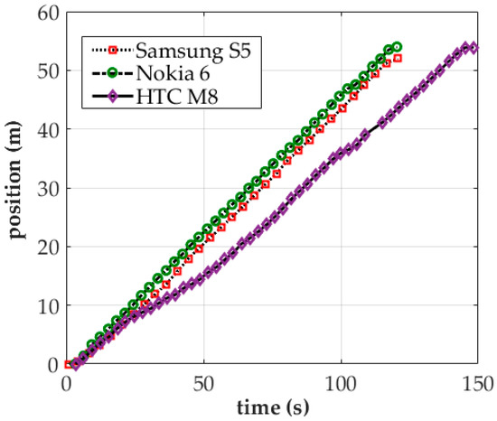 Figure 5 presents the time–position distribution of MS as operated by a Samsung S5, Nokia 6, and HTC M8 on a given route. The x-axis of the figure represents the scan completion reporting time and the y-axis denotes the reporting position. The sampling procedure lasted longer on the HTC M8 (approximately 150 s) than on the Nokia 6 and Samsung S5 (both 120 s). The number of valid scans completed was 49 on the HTC M8, 40 on the Nokia 6, and 31 on the Samsung S5. On average, the Nokia 6 and HTC M8 reported scanning results every 3 s, whereas the Samsung S5 did so every 4 s.