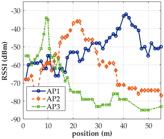Figure 6 depicts the RSSI distribution of three APs obtained using MS by HTC M8. AP1 and AP2 were used to establish a Wi-Fi service on campus. The APs sent strong signals over a long distance, and thus their RSSI distributions declined steadily. AP3 was an AP router installed in a lab. The AP had lower output power and its RSSI distribution declined rapidly in comparison with those of the other two APs. Not all scan reports contained complete signals. Of the 49 scan reports from this experiment, 48, 47, and 41 contained the AP1, AP2, and AP3 signals, respectively. Additionally, the AP3 signal was not detected at many sampling positions between 40 and 50 m.