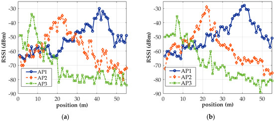 RSSI distributions of signals collected at the 5-GHz band by using different APs (the distributions were derived through the NVA algorithm). (a) AP1; (b) AP2.