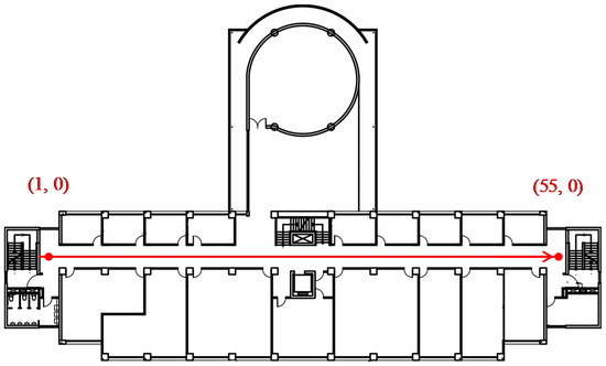 The experiment was conducted on the fifth floor of the Electrical Engineering and Computer Science Building of Chung Yuan Christian University in Taoyuan City in northern Taiwan. Figure 9 shows the floor plan of the experimental site. The building has eight floors. Each floor has staircases on the left- and right-hand sides and another stairway and elevator in the middle. The fifth floor has an open space for students to engage in recreational and academic activities. We collected AP signals on a path from (1, 0) to (55, 0) along the hallway of this floor. In this building, over 40 AP signals were captured in each scan, totaling more than 600 APs, thereby indicating that AP distribution is dense.