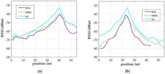 During SMS, one valid Wi-Fi signal was acquired from the location where each IC occurred. SS lasted for 1 min at each 1-m gap between sampling positions and yielded the mean of the RSSI values in this study. A tripod was used to aid SS and reduce human interference in signal collection. SS and SMS both eliminate the need to reconfigure the initial status of a smartphone or limit the number of apps running on it. Both have high error tolerance from operational mistakes but take longer time to complete scanning. Figure 8a,b presents the respective distributions of signals collected from APs 1, 2, and 3 through SMS and SS by HTC M8. Notably, the RSSI values of AP signals acquired through SMS changed in a highly similar manner to those of AP signals acquired through SS. Even when 20 SS-collected signals were averaged, the RSSI distribution showed a zig-zag pattern; in other words, it is difficult to ascertain from Figure 8a,b alone as to which panel is associated with which sampling method.