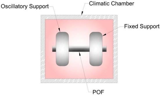 The dynamic mechanical analyzer employed on these tests is the DMA 8000 (Perkin Elmer, Waltham, MA, USA), which presents a temperature controller that can reach temperatures up to 400 °C with a resolution of 0.1 °C. In addition, the analyzer presents a resolution for the modulus estimation of 0.0001 Pa in a range of 103–1016 Pa, whereas the displacement resolution is 1 nm in a range of ±1000 µm. The experimental setup is presented in Figure 1. The test consists of applying an oscillatory displacement with a constant amplitude of 0.049 mm on the POF sample. The constant frequency of oscillation is 1 Hz, and the temperature varies from 25 to 120 °C. The test was conducted following the ASTM D5418 standard employed in dynamic mechanical property analysis for polymers, where the fiber is clamped on fixed and oscillatory supports prior to the application of a predefined load of about 10 N that inhibits the sample slippage, and temperature is increased at a rate of 1 °C/min.