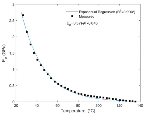 Figure 2 shows the variation in Young’s modulus with the temperature, which gives the static component of the Young’s modulus obtained with Equations (1) and (3).