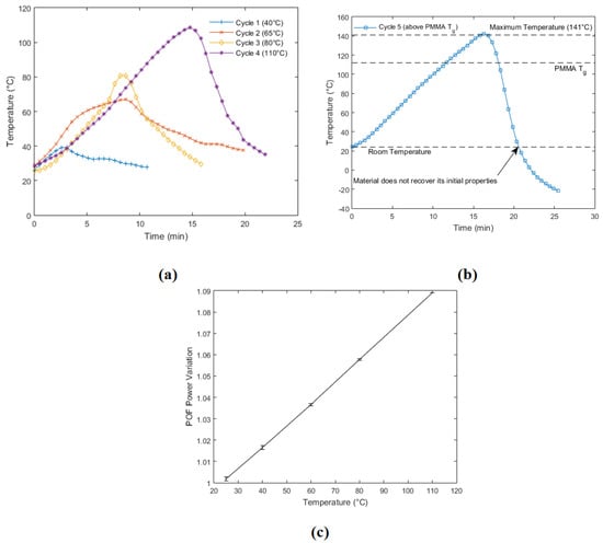 Repeatability tests for the POF temperature sensor. (a) Cycles ranging from 40 to 110 °C to show the sensor behavior with increasing and decreasing temperatures. (b) Sensor response on a test with temperatures higher than the PMMA Tg. (c) Repeatability of the temperature sensor on the cycles presented in (a).