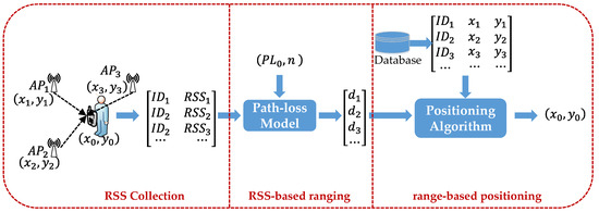 BLE indoor positioning can be divided into two different schemes: fingerprint-based and range-based. Both schemes rely on the Received Signal Strength (RSS) of the Bluetooth signals. The fingerprint-based scheme consists of two stages: the off-line stage and the on-line stage. In the off-line stage, the RSS from the anchor points (APs) at test points are collected (also named fingerprints) and a fingerprint database is then constructed. In the on-line stage, matching algorithms, such as the Weighted K-Nearest Neighbor (WKNN) and the Bayesian-based matching, are implemented to estimate the unknown points’ (UPs) coordinates on the basis of the measured RSS and fingerprint database. Although fingerprint-based BLE positioning could achieve relatively high positioning accuracy, one meter in proximity mode [11], the collection and construction of the database would not be energy-efficient and environment-adaptive. The range-based positioning scheme calculates the distances between APs and a UP on the basis of the measured RSS and the Path-Loss Model (PLM), which can be called RSS-based ranging, and conducts trilateration to obtain the coordinates of the UP. The RSS-based ranging is lightweight and more flexible than fingerprinting, and the trilateration method could achieve more accurate positioning results when the PLM is correctly modified [12]. However, the RSS easily fluctuates because of the obstacles present indoors, which are, especially, the human bodies.