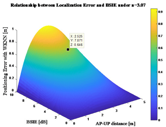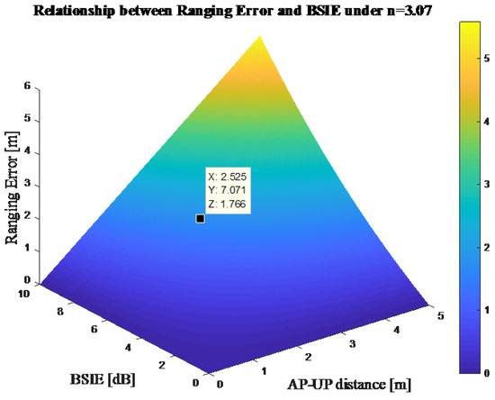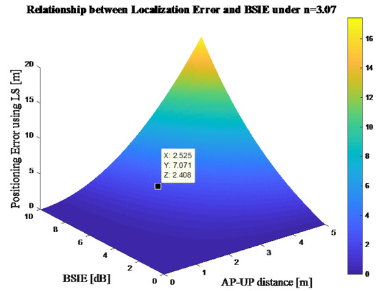 The relationship between the positioning error and the BSIE can also be shown as in Figure 4, with the parameters and n set as 5 m and 3.07, respectively.