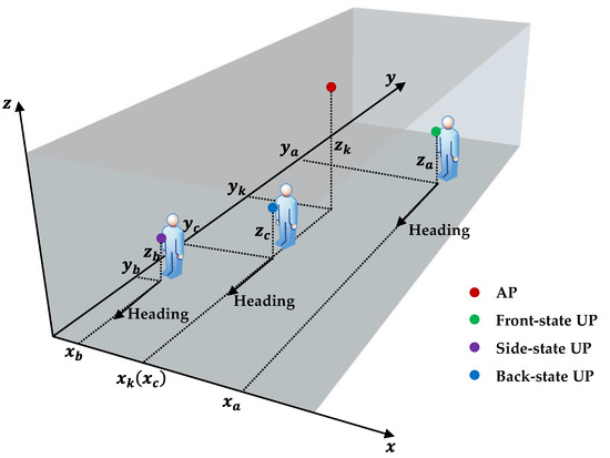 The “front-state” is the situation in which the AP is in front of the UP, corresponding to the green point in Figure 5. The “back-state” is the situation in which the AP is behind the UP, as indicated by the blue point. The “side-state” is the situation in which the AP is behind and on the side of the UP, as indicated by the purple point. In other words, the “side-state” means that the Bluetooth signal is partly shadowed by the human body. The range of coordinates for these three shadowing states can be represented by Equation (24) according to the description in Figure 5: