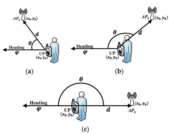 IMU can measure one’s attitude and acceleration using accelerometers and gyroscopes and has been generally integrated in off-the-shelf smartphones. The heading information could be derived according to ones’ angular velocity and acceleration based on the iteration of quaternion [28]. This paper makes the assumption that the smartphone is carried in front of the human body when is located, and the heading information could be used to represent the orientation of the human body. In addition, the body-shadowing detection strategy in this paper utilizes the projections of AP and UP in the X-Y plane and the heading information to distinguish the shadowing states mentioned in Figure 5. The diagram of the proposed strategy is shown in Figure 6, and the definitions of the symbols in Figure 6 are given in Table 1.