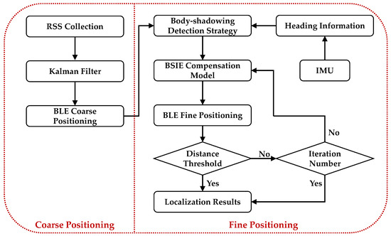 Based on the body-shadowing detection strategy and the BSIE compensation model, the BP-BEC algorithm is proposed to mitigate the effect of body-shadowing and improve the performance of positioning systems in terms of accuracy and robustness. The flow chart of the BP-BEC algorithm is shown in Figure 7. The BP-BEC algorithm performs positioning process in two stages: coarse positioning and fine positioning. In the coarse-positioning stage, the RSS measurements from different APs are collected at a UP, and a Kalman filter is utilized to filter the measurement noise and to smooth the measurements. Then, the LS method or WKNN algorithm is implemented to obtain the coarse positioning results. It should be noted that these positioning results are called coarse results because of the existence of the body-shadowing error.