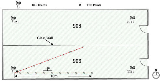 Figure 9 shows the planer graph and the deployment of the BLE beacons (also named APs) in the Test bed 1. This test bed, with an area of 8 m by 16.46 m, consists of two office rooms, which are separated by a glass wall in the middle. The whole area in Test bed 1 was covered with Bluetooth signals from four beacons with different Universally Unique Identifiers (UUIDs), and the beacons were deployed around the room corners up on the ceilings, as shown in Figure 9. The test points are indicated by black crosses. The operating frequency of the BLE beacons was 2.4 GHz, and the signal transmitting frequency was about 2 Hz, which, in other words, means that we could collect two RSSs in one second. We conducted experiments to evaluate the body-shadowing influence on RSS in Test bed 1.