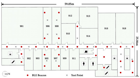 The planer graph of Test bed 2 and the deployment of APs are shown in Figure 10, along with the implementation of the test points. This area is 25.86 m wide and 59.05 m long, and was covered with Bluetooth signals from 30 BLE beacons with unique UUIDs. The deployment of the beacons was ordered as T-shape lines with an interval of about 5 m, indicated by the red dots in Figure 10. Experiments on positioning performance evaluation were conducted in Test bed 2, and the locations of the test points are shown as black crosses in Figure 10.