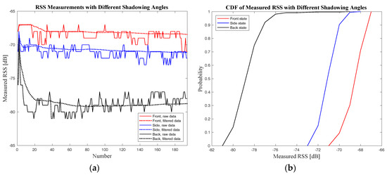 The original RSS data and the filtered RSS data at a distance of 3 m for three shadowing angles of AP9–UP pair are shown in Figure 11a. The Cumulative Distribution Function (CDF) of the measured RSS is also shown in Figure 11b in order to give a better demonstration of the body-shadowing influence.