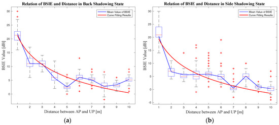 The relation between the BSIE and the AP–UP distance for different shadowing angles: (a) the relation between the BSIE and the distance in the “back” state and the curve fitting results; (b) the relation between the BSIE and the distance in the “side” state and the curve fitting results.