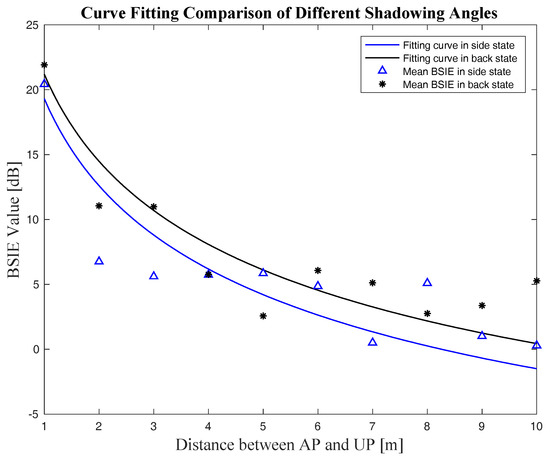 The relations between the measured BSIE and the AP–UP distance for both the “back” and the “side” shadowing angles were evaluated and represented in Figure 12. Meanwhile, the curve fitting was done based on the BSIE compensation model proposed in Section 3.2 utilizing the measured data. The fitting results are also shown in Figure 12, and the comparison of fitting curves for different shadowing angles together with the curve parameters are shown in Figure 13 and Table 2. Curve fitting was also done to estimate the parameters of PLM in our experimental environments; the PL0 was −50.06 and n was 2.33.
