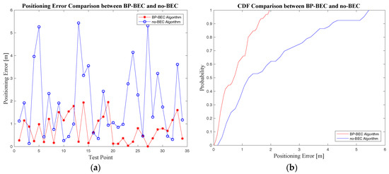 The comparison of positioning accuracy between the BP-BEC algorithm and the algorithm without body-shadowing error compensation (no-BEC): (a) positioning error comparison in scatter diagram; (b) positioning error comparison in CDF.
