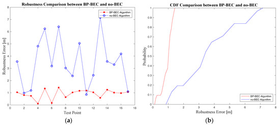 The comparison of positioning robustness between the BP-BEC algorithm and the traditional algorithm: (a) positioning robustness error comparison in scatter diagram; (b) positioning robustness error comparison in CDF.