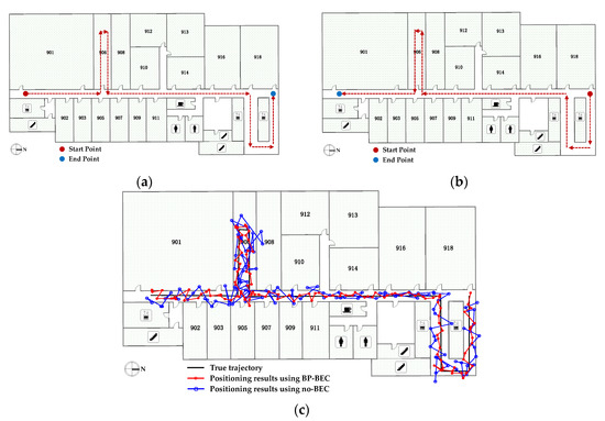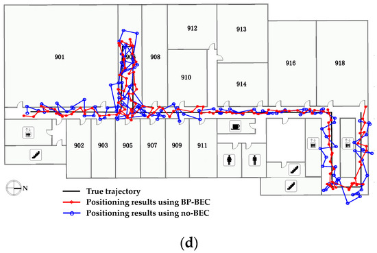 In order to evaluate the performance of the proposed algorithm under a dynamic situation, experiments were conducted in Test bed 2, and two trajectories were selected. The device was held by the tester in front of the body while the tester moved at a walking speed. The real trajectories in Test bed 2 are shown in Figure 17a,b. With an IMU-aided method, the RSS data at a UP was collected and filtered in each step interval for both the BP-BEC and the no-BEC algorithms to generate positioning results, and the positioning results in a moving condition along the trajectories for both algorithms are shown in Figure 17c,d. It can be concluded that the real-case situation localization is not affected by the convergence speed of the BP-BEC algorithm, and both the positioning accuracy and the robustness were improved compared to the no-BEC algorithm.
